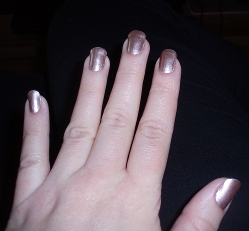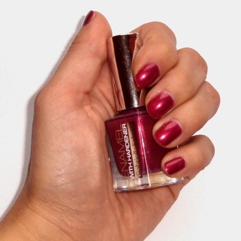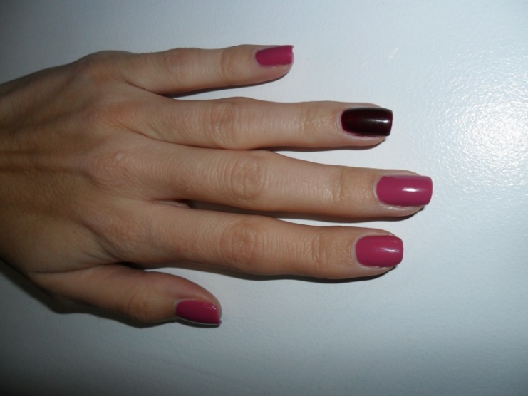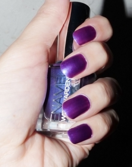 Tmavě fialová s trochou růžových třpytek. 3 vrstvy - při dvou je ještě pořád průhledný a malinko proužkuje.. Při umělém osvětlení jde víc do modra.