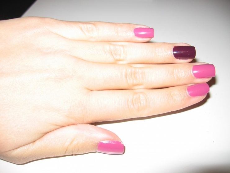2) Celý minulý týden jsem běhala s fialovo - růžovým, růžový je Rimmel Velvet rose a prsteníček je NYC Manhattan.