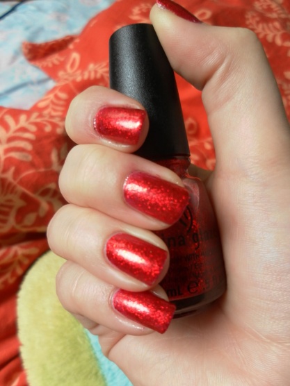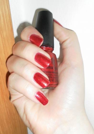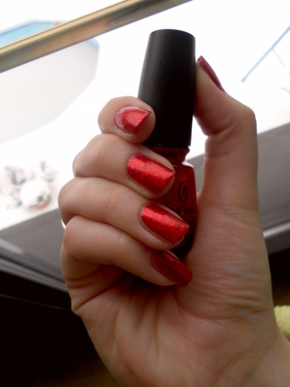 nádherný vánoční kousek China Glaze Ring in the Red, 3 vrstvy + seche, tvoří jej dočervena zbarvená tekutina v níž jsou malinkaté a větší červené třpytky, ve druhé a třetí vrstvě tvoří jednolitý červěný třpytkovatý nátěr, krásně se třpytí..