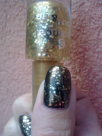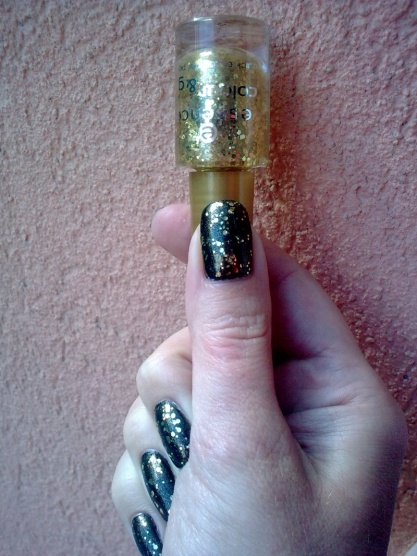 Dost kecání. A teď jeden drogérkový šunt: Třpytky essence 67 make it golden přes černý lak.