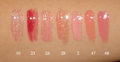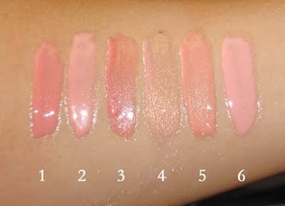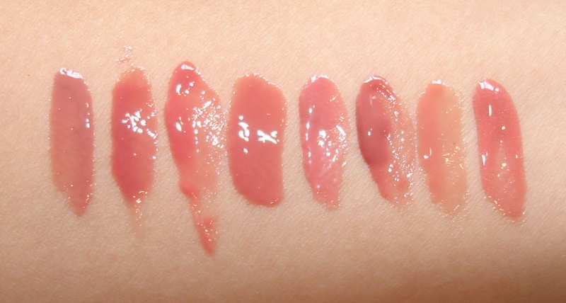 Chanel Giggle Glossimer, Chanel Praline #46 Glossimer, Chanel Bel Air #147 Glossimer, Chanel Glass Quartz Aqualumiere Gloss #69, Laura Mercier Blush, Laura Mercier Rose Flush, Bobbi Brown Pink Beige, MAC Full on Lust