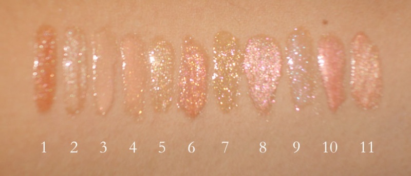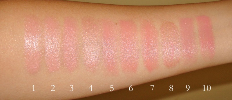 MAC: L to R: 1) Classical, 2) Pure Rose, 3) Hue, 4) Her Fancy, 5) 3N, 6) Nude Rose, 7) Way to Love, Pink Glaze, 9) California Dreamin', 10) Creme Cup