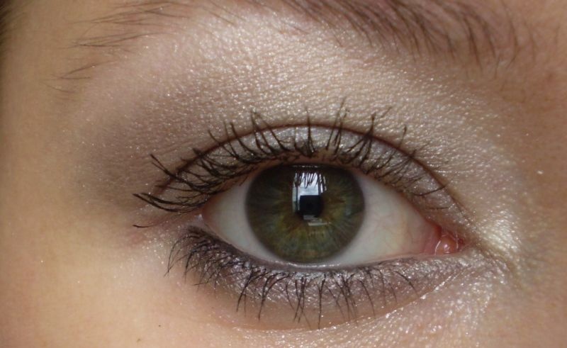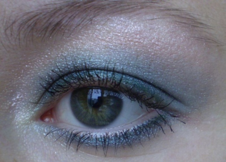 Na celém víčku i "banánku" stíny Too faced Moon beam, pod obočím zelený holograf. Černá tužka Estee Lauder a řasenka Sisley Ultra facil.