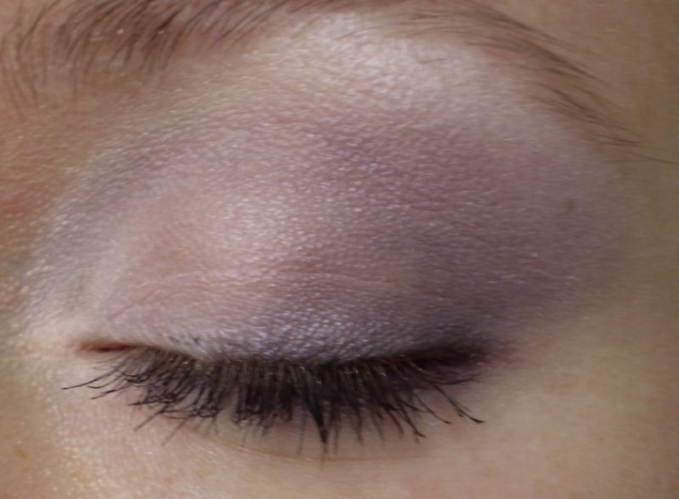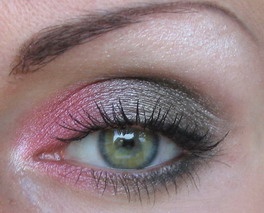 Líčení s paletkou pěti stínů Dior č.880 Gris vip. Pod obočím bílý stín, na víčku světle růžový, na dolním i horním víčku cca od poloviny víčka na konec oka linka černým stínem a přes to a na "banánku" smíchaný šedý a vínovofialový stín.