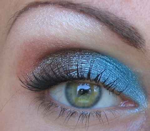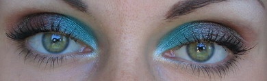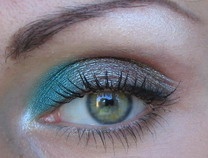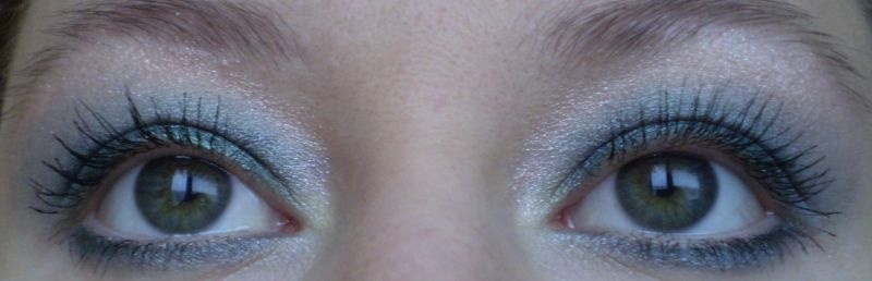 Podklad- MAC Sharkskin, pod obočím Golden rose č.109, na víčku Barry M Aqua, na banánku, vnějším koutku a jako spodní linka Barry M Kingfisher a přes to ještě horní i dolní linka tužkou Golden rose glitter eyeshadow 205.