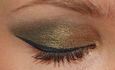 Použila jsem tekutou černou linku Collection 2000, ve vnitřním koutku sypké stíny H&M, ve vnějšku sypké Collection 2000 odstín Lustrous, pod obočí BarryM odstín Gold Irridescent. Jsem ráda, že se líbí
