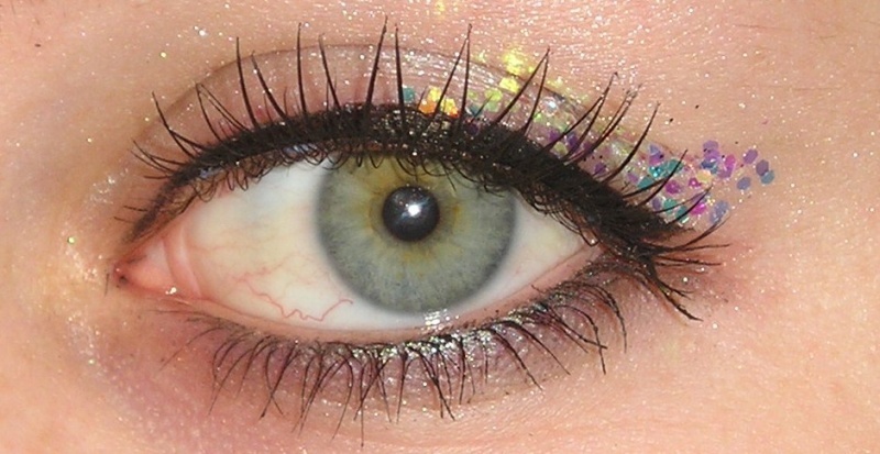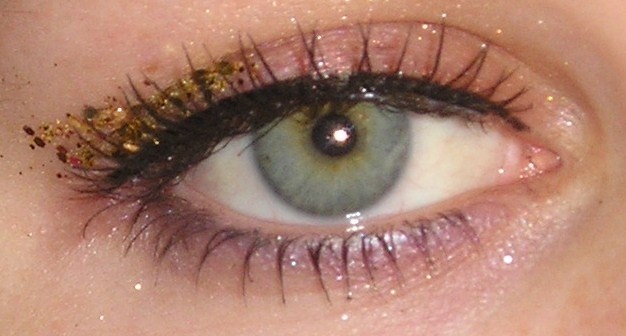 , třpytky od dermacolu jsou spíš modré ale na světle házejí odlesky do zelena a gelová linka essence.