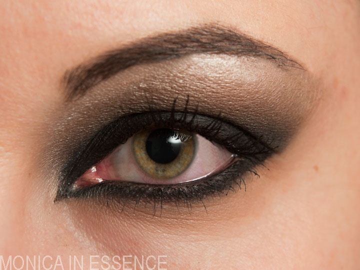. Použila jsem mono stíny Essence č. 39, do záhybu sypké stíny Dermacol č. 4, fialovou gelovou linku Essence a na spodní linku pigment True Purple od NYX.