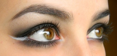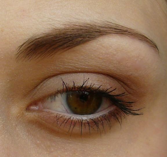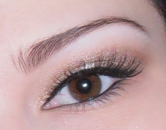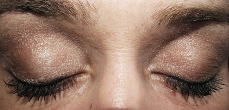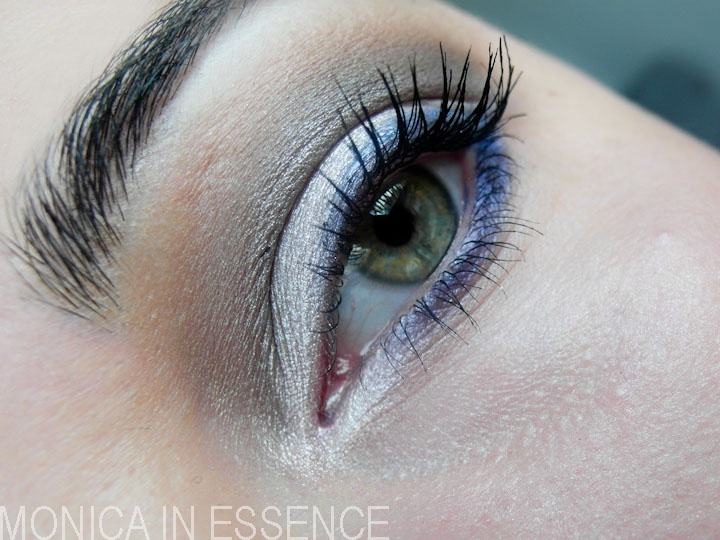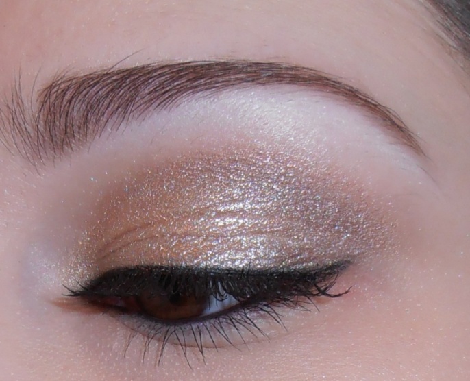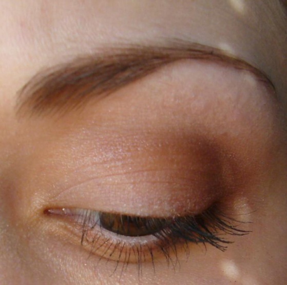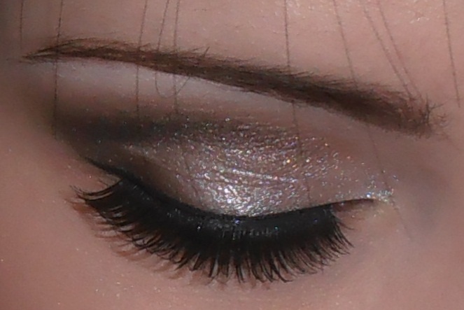 Použity jsou pigmenty Dazzle Dust od BarryM v odstínu Silver Brown, světlý stín z paletky Natural Beauty School od elfu, bílá tužka od BarryM na waterline a růžová řasenka Multi Action od Essence.