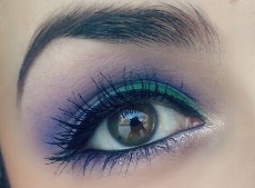 Reaguji na indulonka2: Super, sluší Ti to, já třeba tuhle barvu vůbec nemůžu nosit, nesluší mi, ale Tobě moc! Přidávám dnešní zkoušení, fialovo-zelené líčení a diamantový prach od essence v koutku očí.