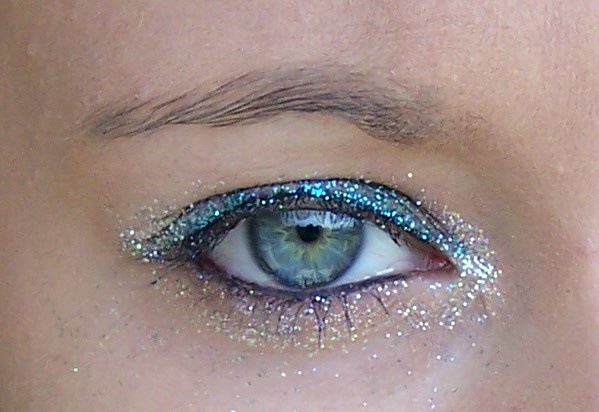 Taky zkouším, poprvé dvoubarevné líčení očí. Foťák ale zkresluje barvy. Tyrkysové líčení - dolní linka essence long lasting eye pencil, horní linka essence eyeliner pen, vnitřní koutek dermacol star choice shine glitters č.5, vnější koutek totéž ale č.1, řasenka rimmel extra super lash building mascara. Ve skutečnosti jsou stíny víc do zelena než do modra