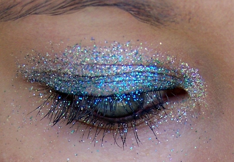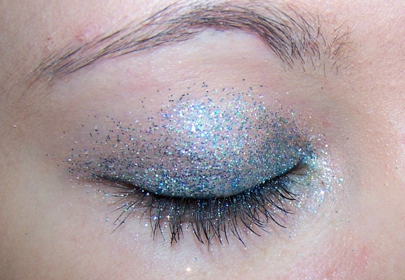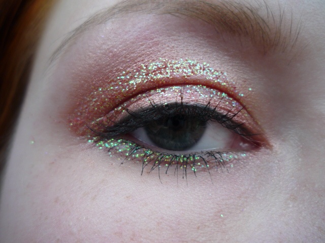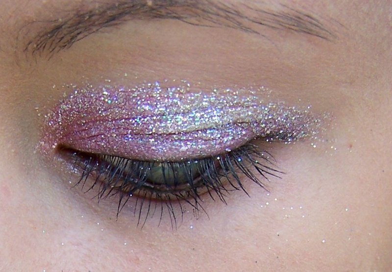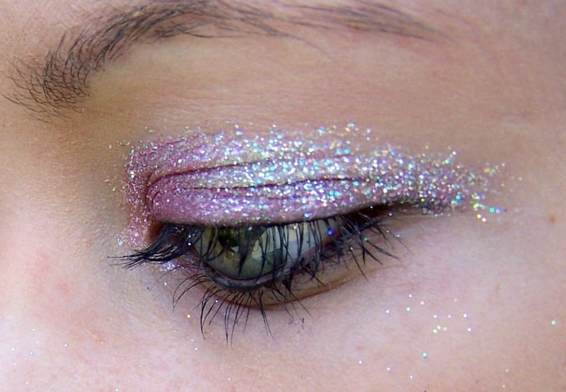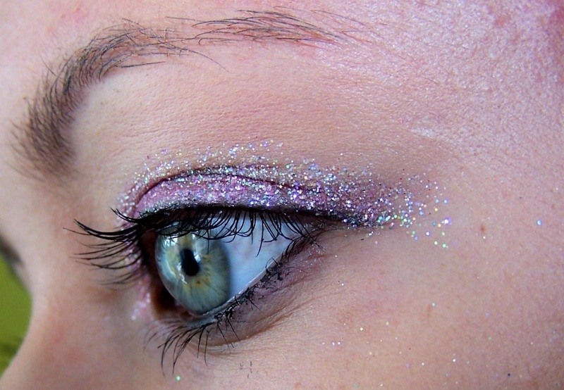 Nyx fanta pearl přes celé oko, do záhybu a dolní víčko nyx apple glitter, černá tužka miss sporty, řasenka maybelline lash expansion
