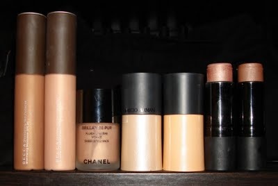 Rozjasňovače: Becca Shimmering Skin Perfector Topaz, Becca Shimmering Skin Perfector Opal, Chanel Brilliance Pur Sunkissed, Armani Fluid Sheer 2, Armani Fluid Sheer 10, Nars Multiple Maldives, Nars Multiple St. Barts