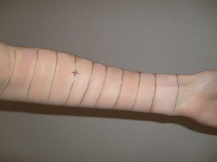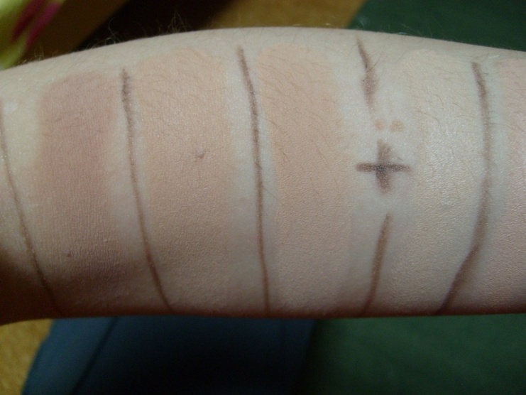 Make-upy + odstíny v popiscích na fotkách. Jen první zleva není make-up, ale tónující krém od e.l.f. z řady Studio. Vypadá oranžově, ale rozetře se uplně do ztracena, nezanechává na pleti žádné krytí, tedy ani tu oranžovou barvu