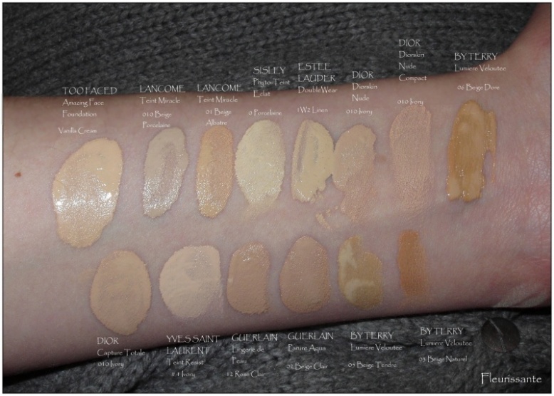 YSL a Dior zľava: YSL #2 (Luminous Ivory), YSL #1 (Luminous Radiance), Dior Skin Flash 002 (Candle Light)