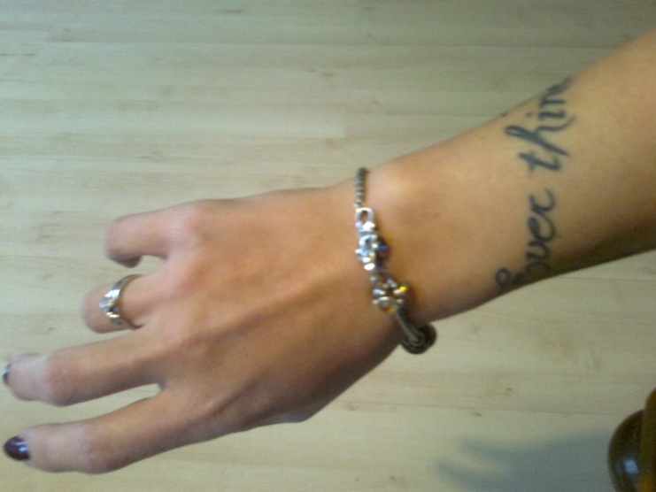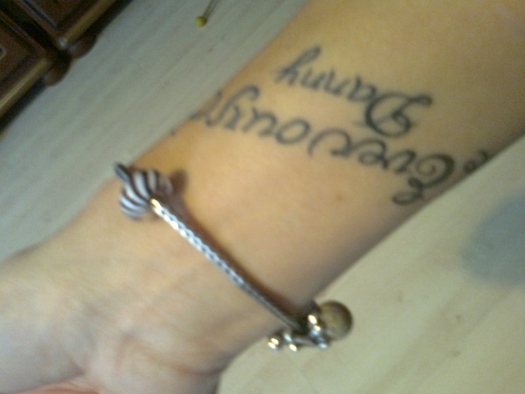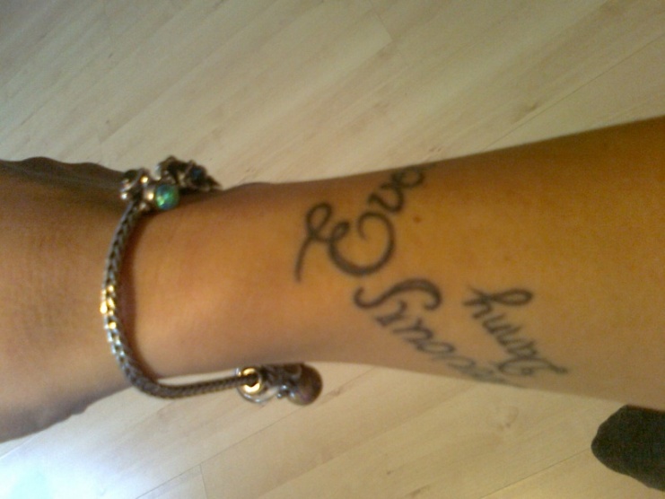 ze všech tří mám tohle nejradši, hodně pro mě znamená, nevýhodou tetování na zápěstí je (to mi bylo řečeno už v salónu), že se kůže na tomhle místě více "opotřebovává", jak se opíráme o stůl, píšeme, oblékáme se atd... je fakt, že tohle tetování mám od dubna 2009 a na některých místech, hlavně blízko ruky by už potřebovalo trochu obtáhnout. Jinak po kotníku a zádech zatím nejbolestivější místo