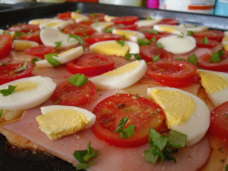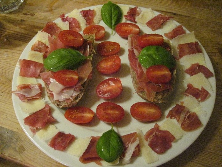 celozrnn peivo se unkou serrano, parmaznem, cherry rajtky a erstvou bazalkou
