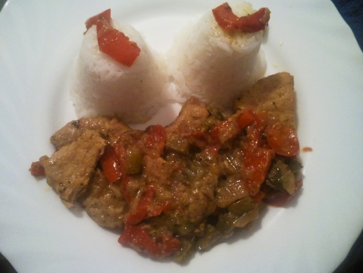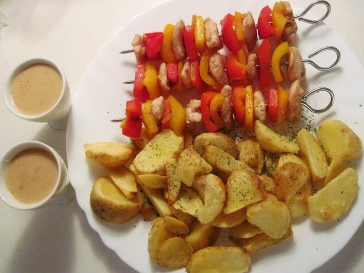 pzy z paprik a kuecch prsou marinovanch v sojov omce a citronov v, americk brambory a mj vymylen dip (kokosov mlko, sticov omka, sojovka a chili pasta)