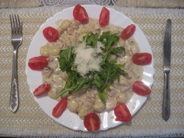 gnocchi, kuec prsa, ampiony, nivov omka, esnek, rukola, cherry rajtka a parmazn