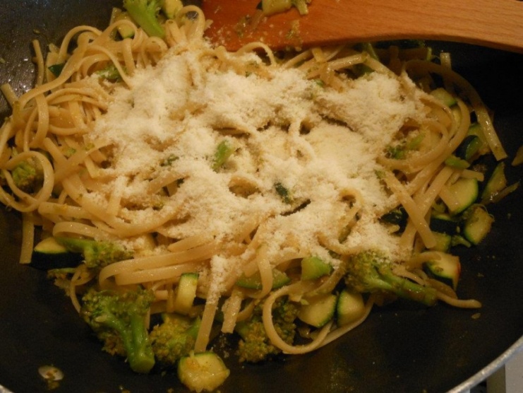 linguine s brokolic, cuketou, esnekem, cibulkou a strouhanm parmaznem