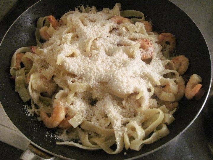 tagliatelle s krevetkami, olivovm olejem, esnekem a parmaznem