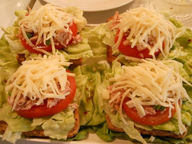 opeen toasty, ledov salt, tuk, rajata, jarn cibulka a strouhan eidam + domc olivov zlivka