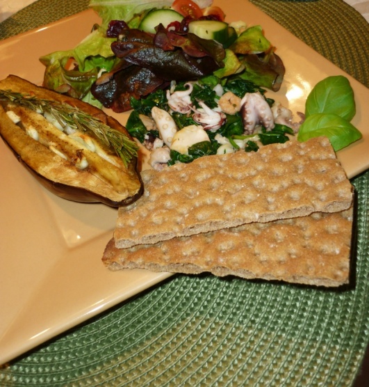 Dnešní oběd - menší pokus. Pečený lilek s česnekem na rozmarýnu a mořské potvůrky se špenátem a brusinkami...