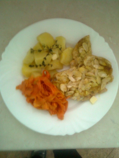 Jinak přidávám další recept, v úterý jsem dělala kuřecí prsa pečená v troubě na kari, s mandlemi a mrkví na másle a je to moc dobrý. Takže: kuřecí prsa lehce naklepat, osolit, posypat kari kořením a z prudka opéct z 1 strany na pánvi, pak dát opečenou stranou na alobal a posypat nakrájenými mandlemi a dát do trouby, tak na 20-25minut na 200C (záleží na troubě, doporučuji dát do alobalu i kousek másla, aby to nebylo suché). Mrkev naškrábat škrabkou na brambory, rozpustit máslo a přidat mrkev, osolit, 1-2lžičky medu a šťávu z citronu, vše dle chuti.