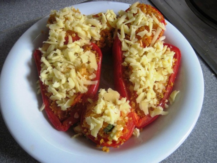 papriky plnn kuskusem, ampiony, mozzarellou a cuketou a navrch strouhan eidam