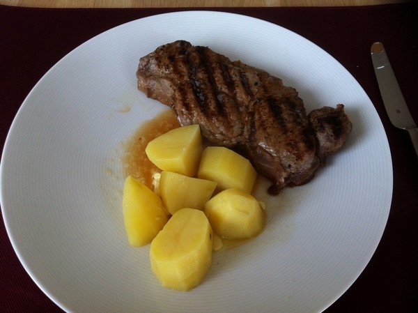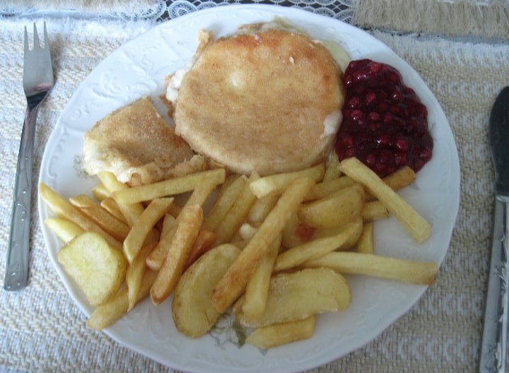 smaen hermeln s brusinkami, americk brambory a hranolky