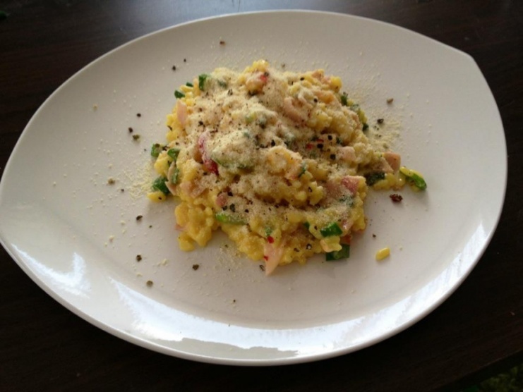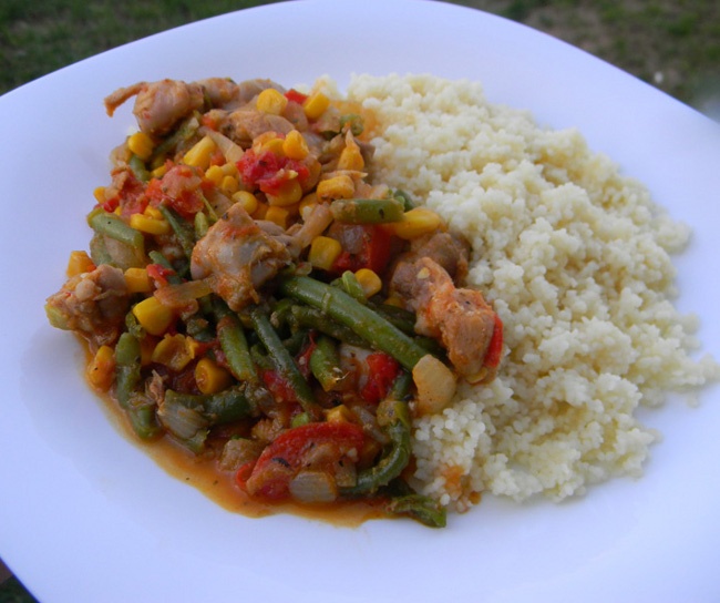 Přidávám rychlovku, kuskus + kuřecí steak s opraženou kukuřicí, fazolkami, rajčetem, cibulí, paprikou..