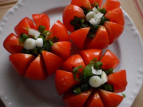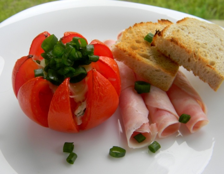 Grilované rajče, plněné nivou a eidamem s kouskem másla, posypané jarní cibulkou s výběrovou šunkou a tousty, jednoduchý a přitom výborný!