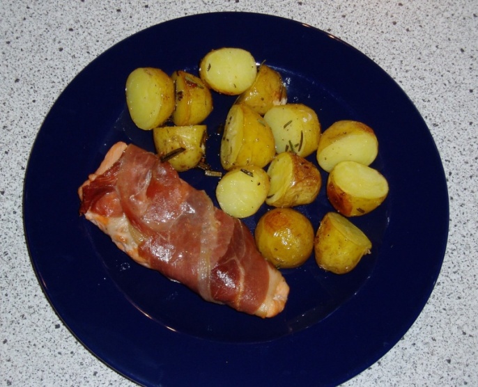 3. Pečený losos v parmské šunce s tymiánovými brambory