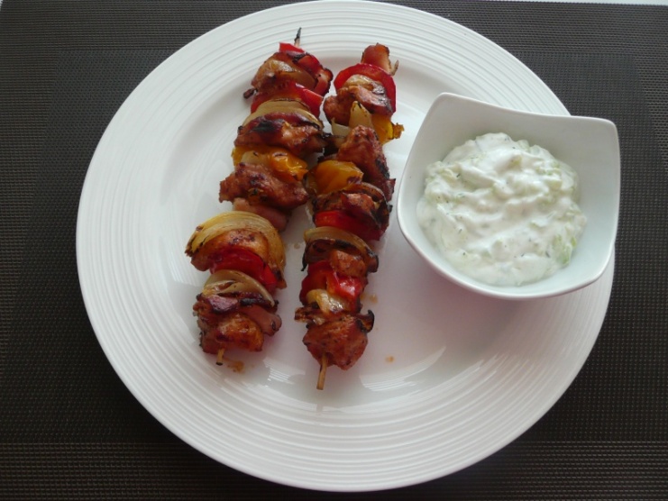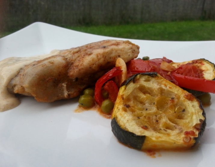 Kuřecí steak, smetanovo-česneková omáčka a grilovaná zelenina v olivovém oleji.