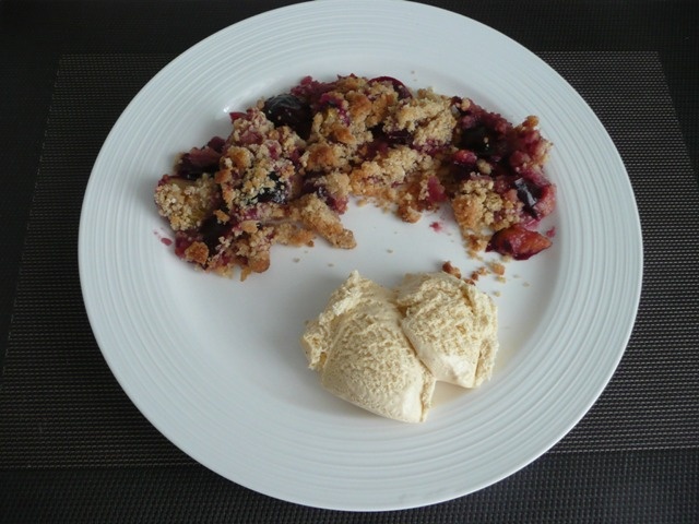 2. Švěstkový krambl se zmrzkou-jen ovoce a drobenka z piškotů