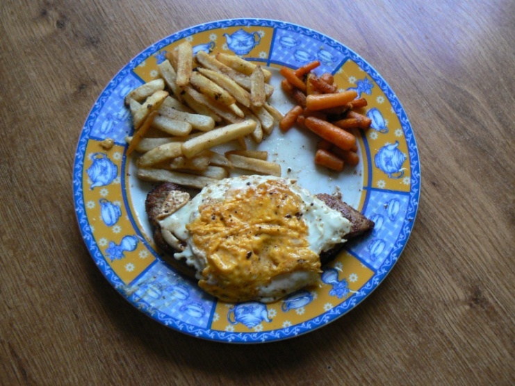 1.) Přírodní vepřový řízek s volským okem, mrkvička a hranolky