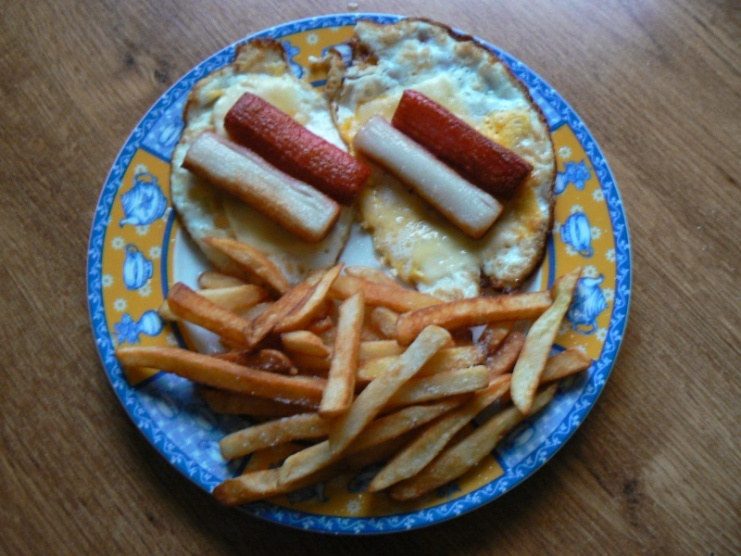 3.) Volská oka s osmaženými surimi tyčinkami a hranolkami