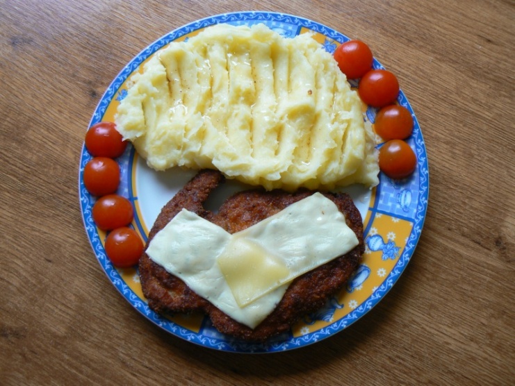 4.) Kuřecí řízek s plátky sýra, rajčátka a bramborová kaše