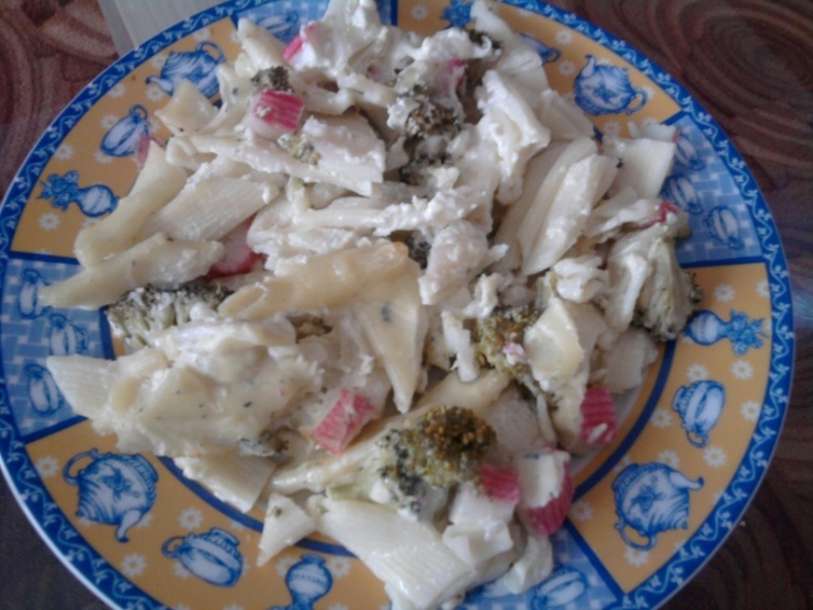6.) Zapečené těstoviny se smetanovo-sýrovou omáčkou, brokolicí a surimi tyčinkami (foceno telefonem)