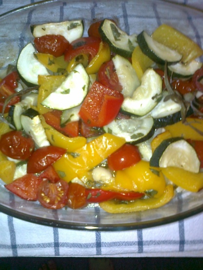 Letní zeleninka s petrželkou a rozmarýnem, zakápnutá olivovým olejem a upečená v troubě. Na talíři posypaná balkánským sýrem, podávaná s rozpečenou bagetkou (nikdy to nestihnu vyfotit na talíři, protože přítel je hroznej nedočkavec, proto fotím hned jak vytáhnu z trouby