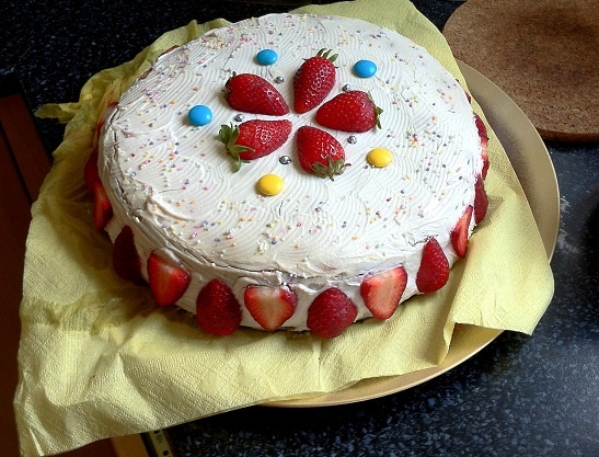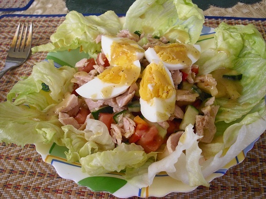& ještě zeleninová salát s tuňákem, vajíčkem a hořčicovým dresingem; narozeninový jahodovo-tvarohový dort pro přítele