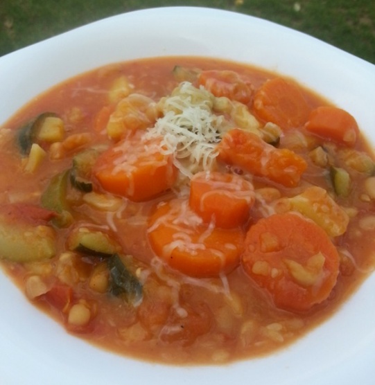 Přidávám dnešní polévku Minestrone. Dělala jsem z cukety, rajčat, lilku, mrkve, celeru, cibule, fazole..