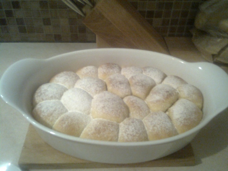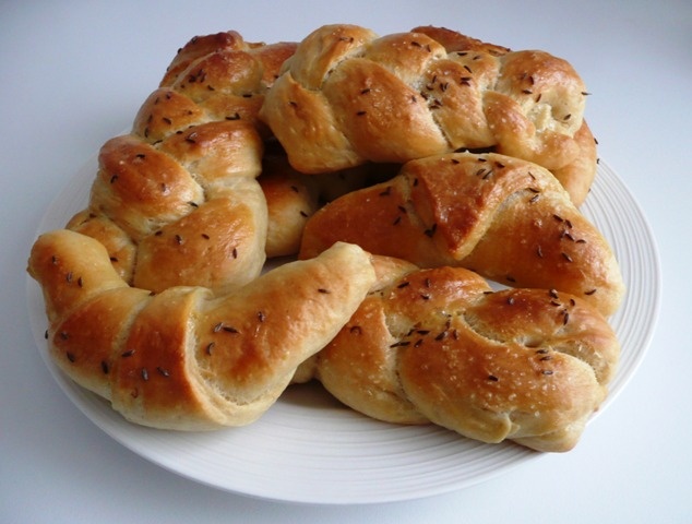 udělala jsem z části vl. mléka, kvasnic, cukru a trošku mouky kvásek a ten jsem dala kynout k vlažném topení asi na 1/2hod. Pak jsem ho přilila k mouce, přidala olej, sůl a zbytek mléka. Zadělala těsto a zase jsem ho dala kynout k topení-klidně na hodinu i dvě. S těstem se moc dobře pracovalo (musí se důkladně prohníst), nelepilo (pokud by lepilo, stačí přidat trošku mouky), pěkně šlo vyválet. Po vyválení jsem smotala housky a ještě chvilku nechala nakynout na plechu. Chce to válet malé houstičky-dost to vše ještě nabude. Potřela jsem housky rozšlehaným vajíčkem, přidala hrubou sůl, kmín a pekla jsem asi na 170st. do zezlátnutí-cca 30min? Už nevím, matlala jsem je vajíčkem trošku déle, ne hned před vložením do trouby.