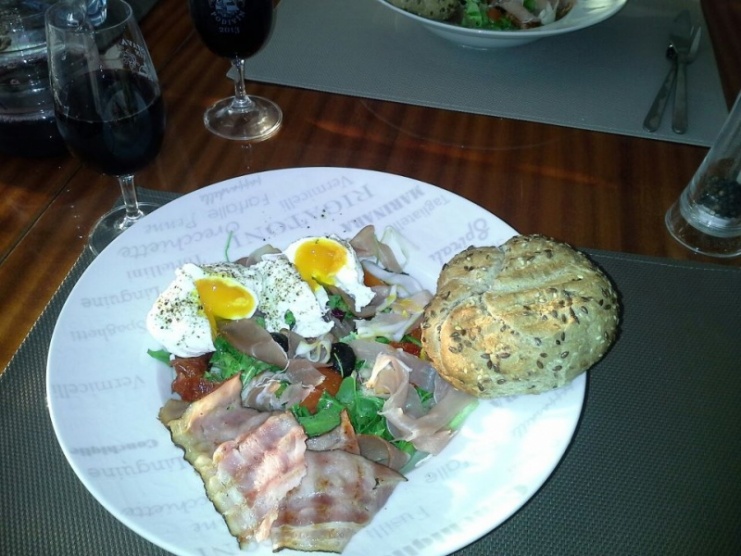 Kuřecí stehenní steak si den předem naložím v koření a oliv.oleji a pak griluji na kontaktním grilu. Salátek dělal manža, tak jen tak od oka. Rukola + salátová okurka + cherry rajčátka + vejce na tvrdo + orestované žampiony včetně šťávy,kterou pustí + dresing z majonezy. Je vydatnější, ale luxusní