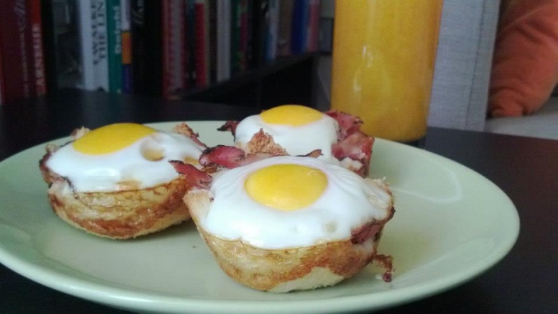 Vymažeš si formu na muffiny, vtlačíš do každé plátek toastového chleba s odkrojeným krajem. Osolíš, opepříš trochu, vysteleš anglickou slaninou a do každého vyklepneš jedno vajíčko a dát zapéct