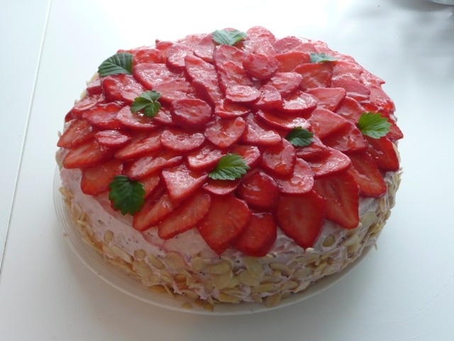 no a jahody jsem každý plátek dala na chvilku do teplého želé a ihned skládala na dort.