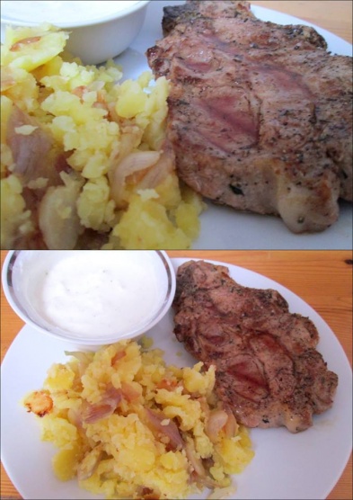 Vepov krkovice s rozmarnem se ouchanm bramborem s esnekem a alotkou
