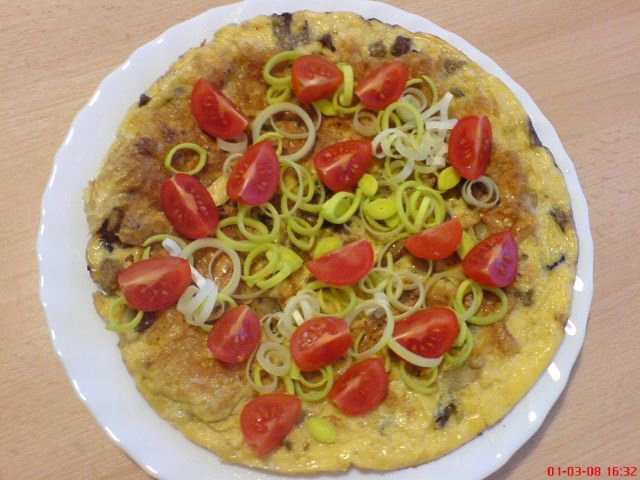 vajecna omeleta s hlivou ustricnou, cherry rajcatka a jarni cibulka