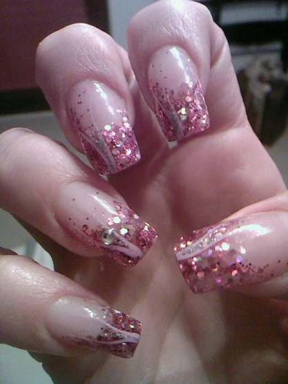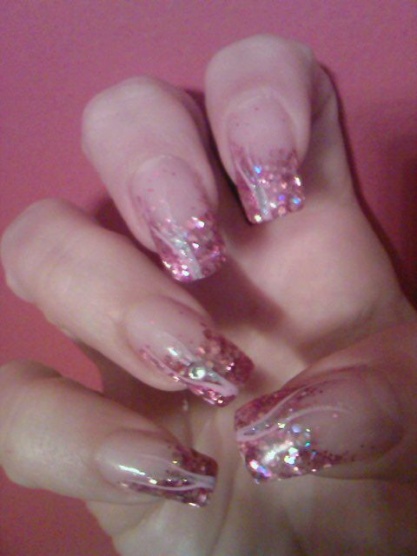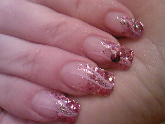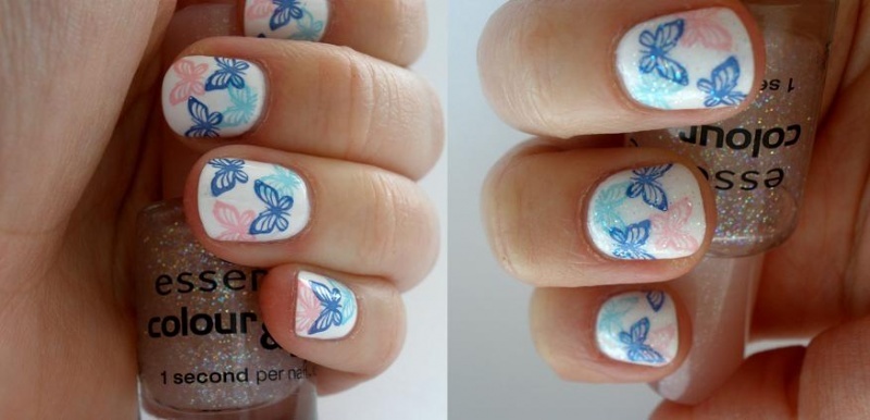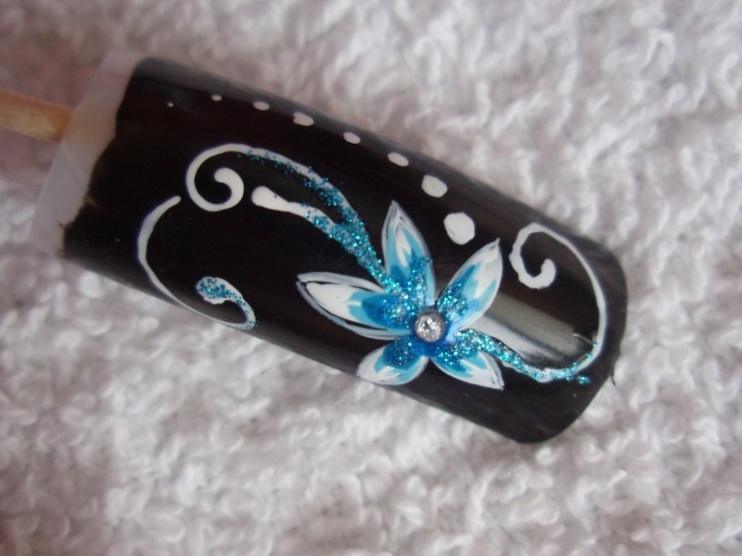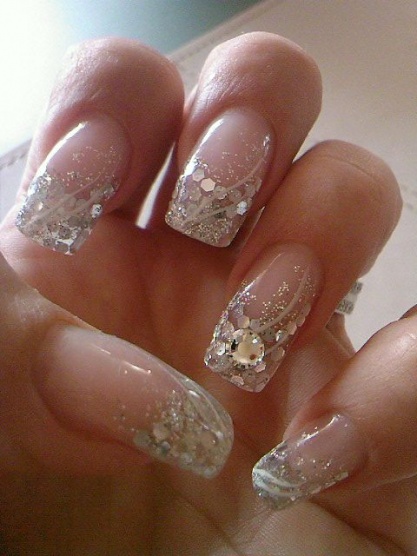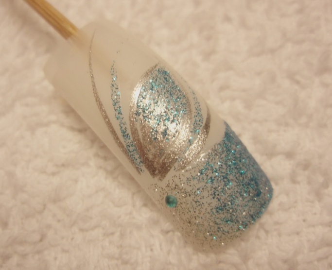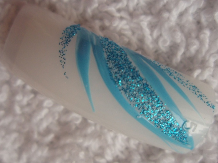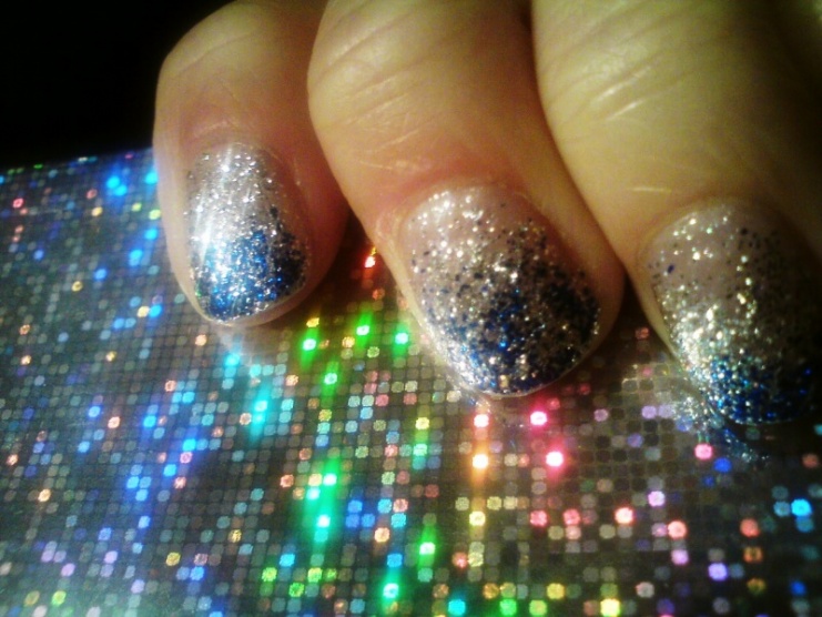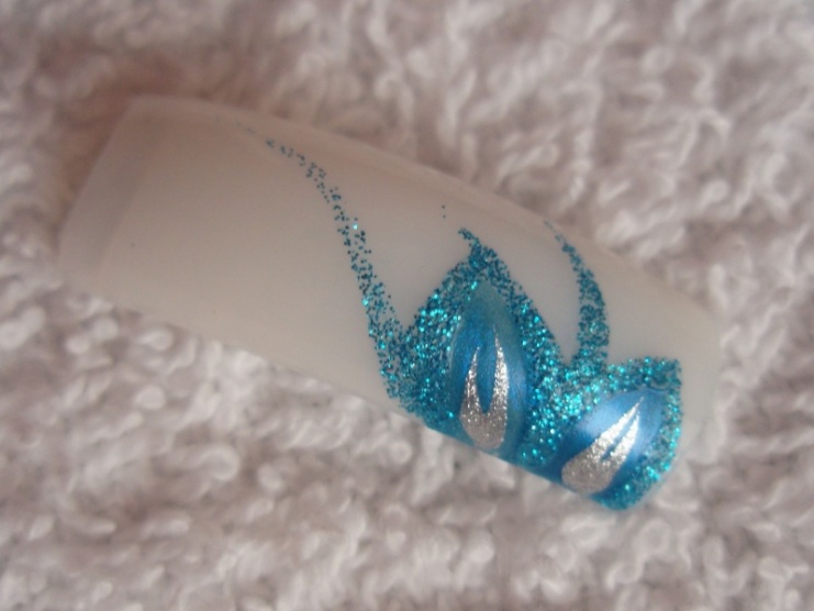 podklad - kalcium od FS, lak 56second od Gabrielly Salvate, třpytivý zpevnovač od Essece, stříbrné třpytky, pak modré a pak top coat od Yves Rocher... lak od Salvate a třpytky jsem nanášela houbičkou.