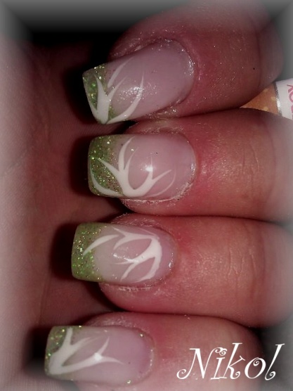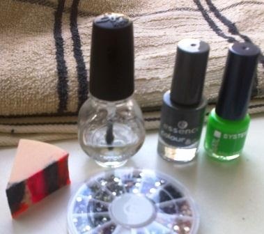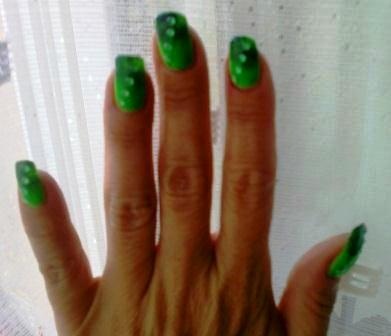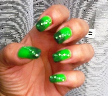 nejde to vyfotit, v reálu neskutečně svítivá psycho jasná zelená, špičky šedá Essence houbičkou, zel.kamínky
